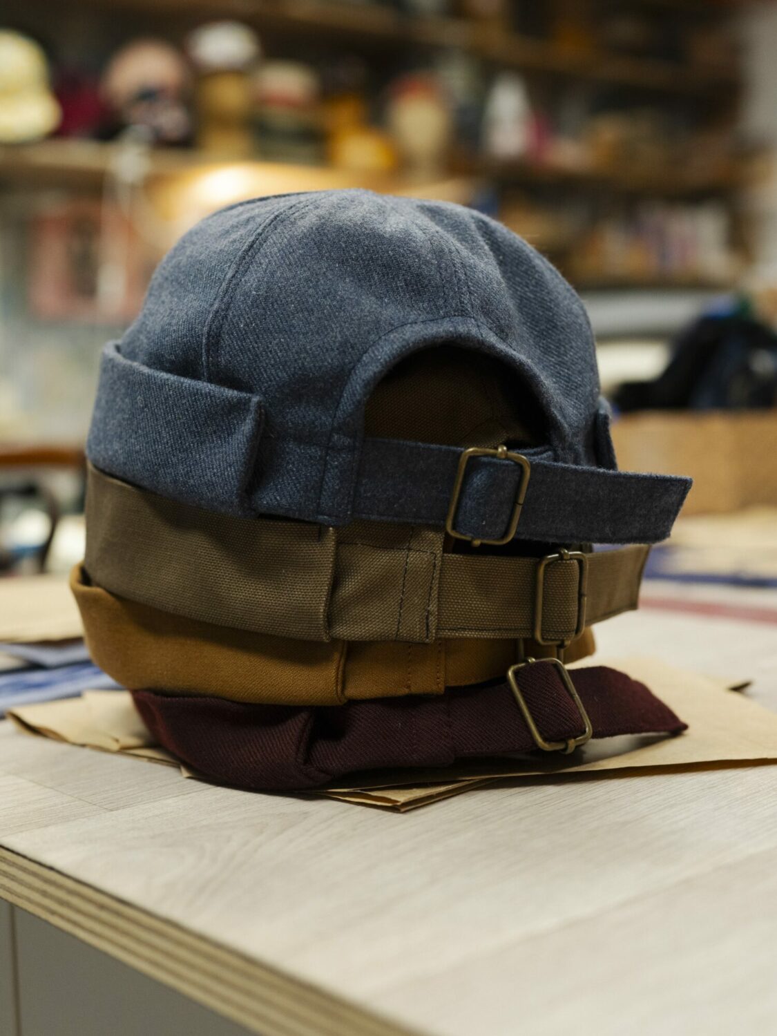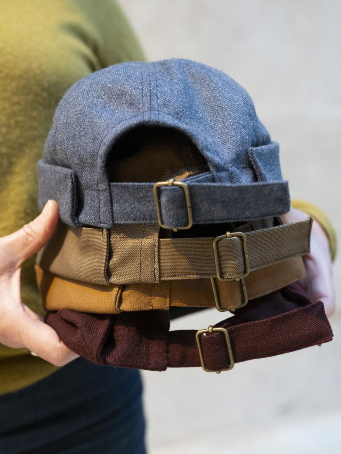 Le bonnet docker réglable est en coton ou en laine selon le tissu utilisé. Le bonnet docker existe en deux tailles, 53/56 et 57/60, il est réglable grâce à une boucle en métal au dos.
