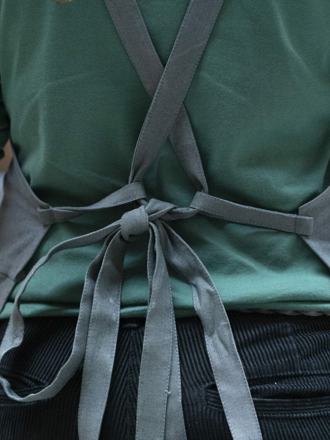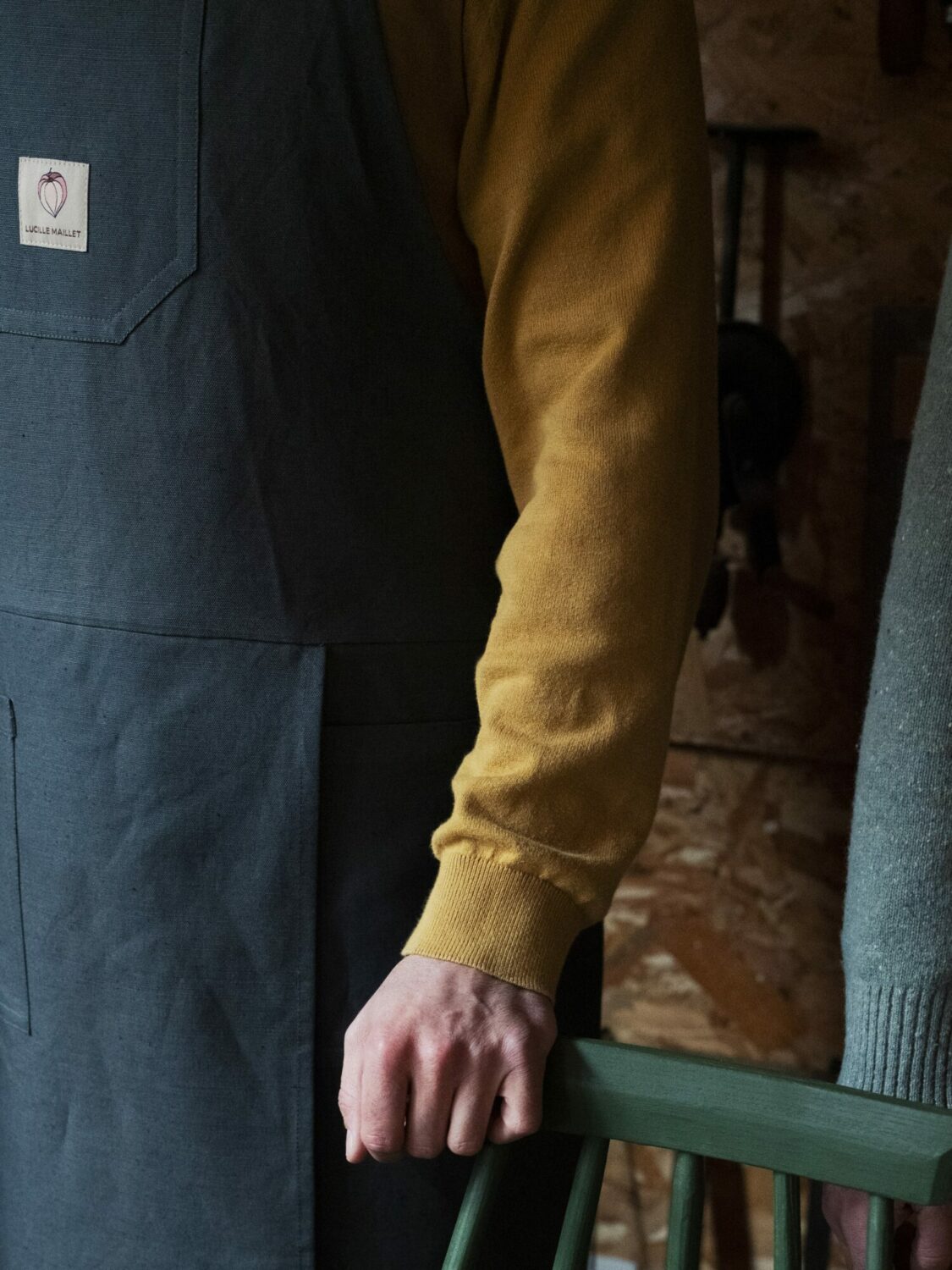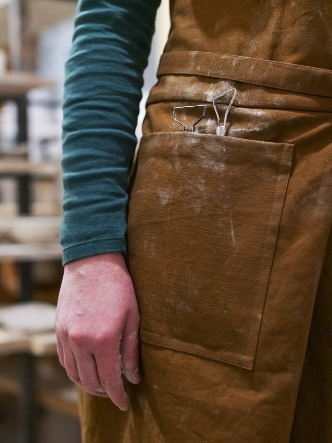Le tablier existe en deux versions et pensé au début, pour le travail au tour des potiers.