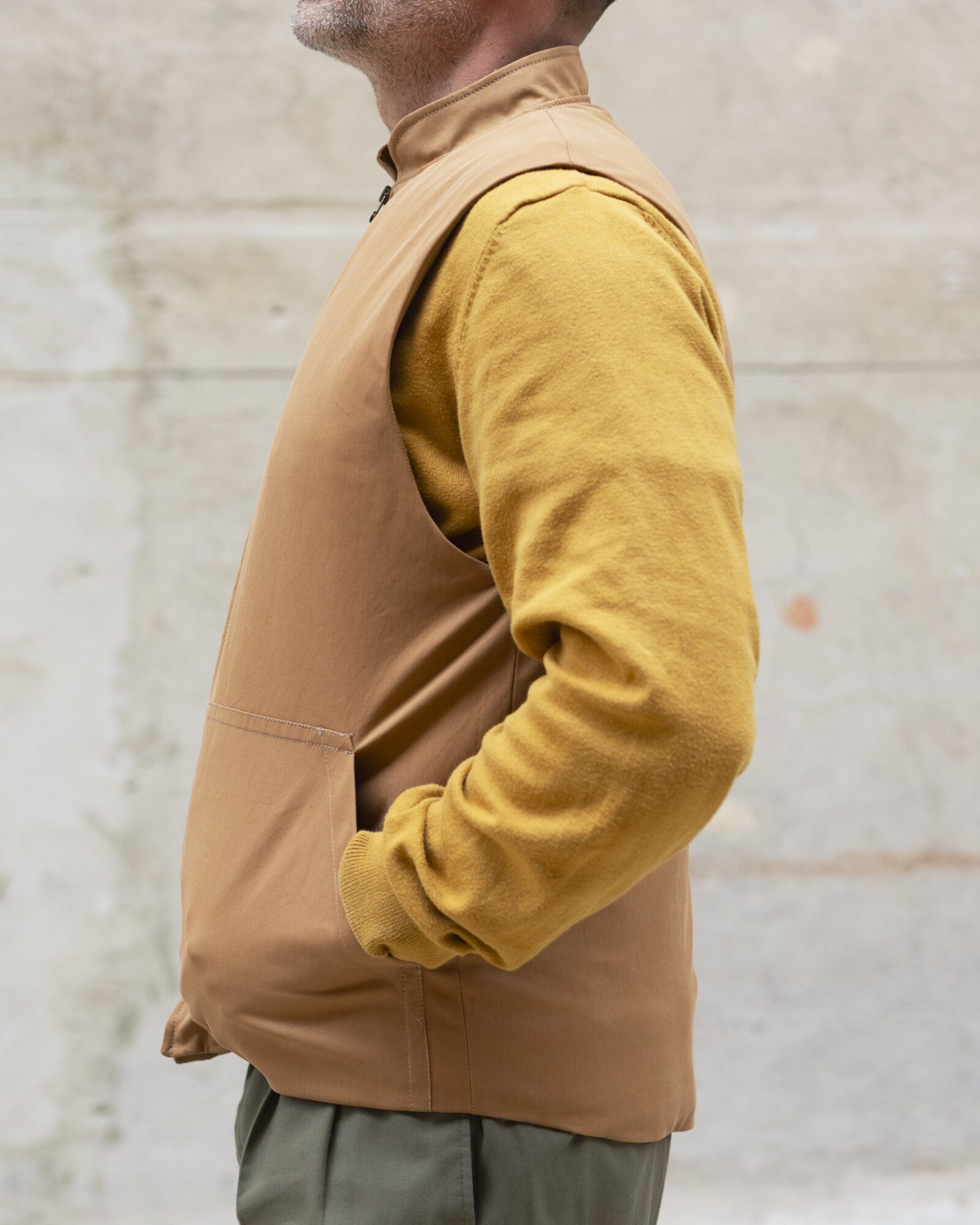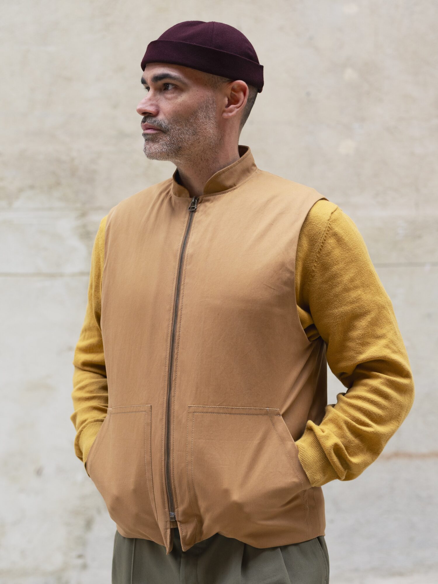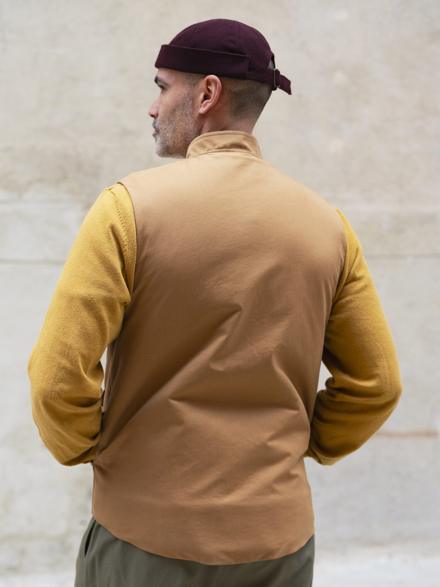 Ce gilet sergé coton beige foncé avec un doublure en laine rouille à motif beige, d’Atelier Lucille Maillet est une fabrication artisanale drômoise. Il est pensé pour durer et être réparés si besoin. Il est prévu pour être porté par-dessus ses propres vêtements pour apporter chaleur et confort sans contraindre les mouvements.