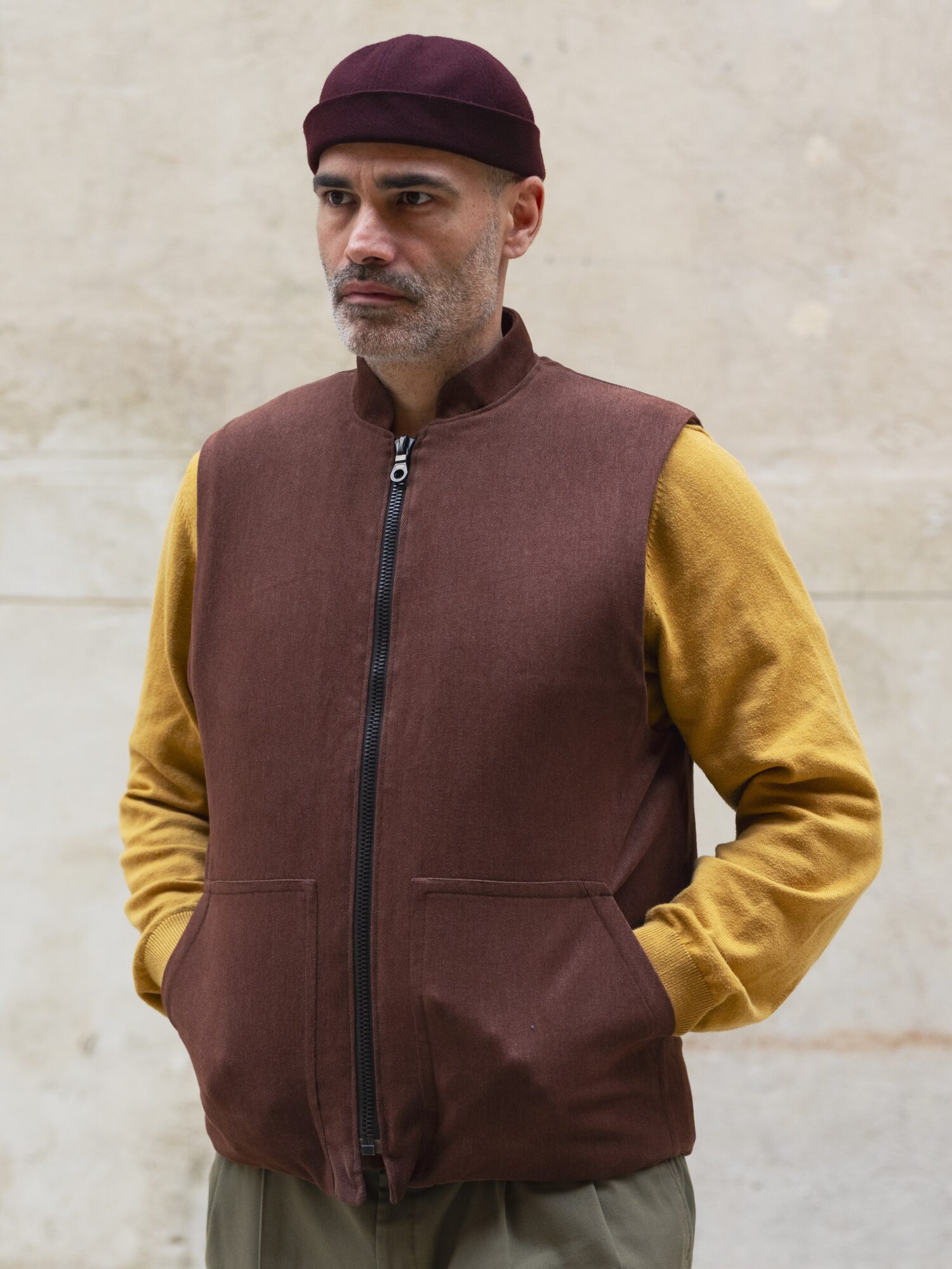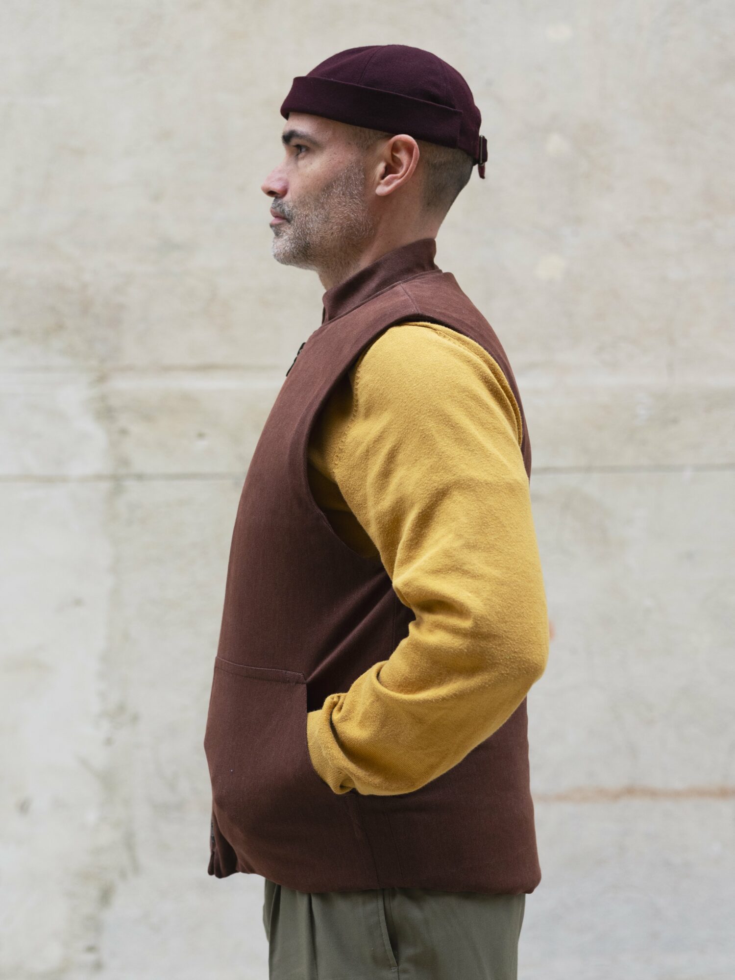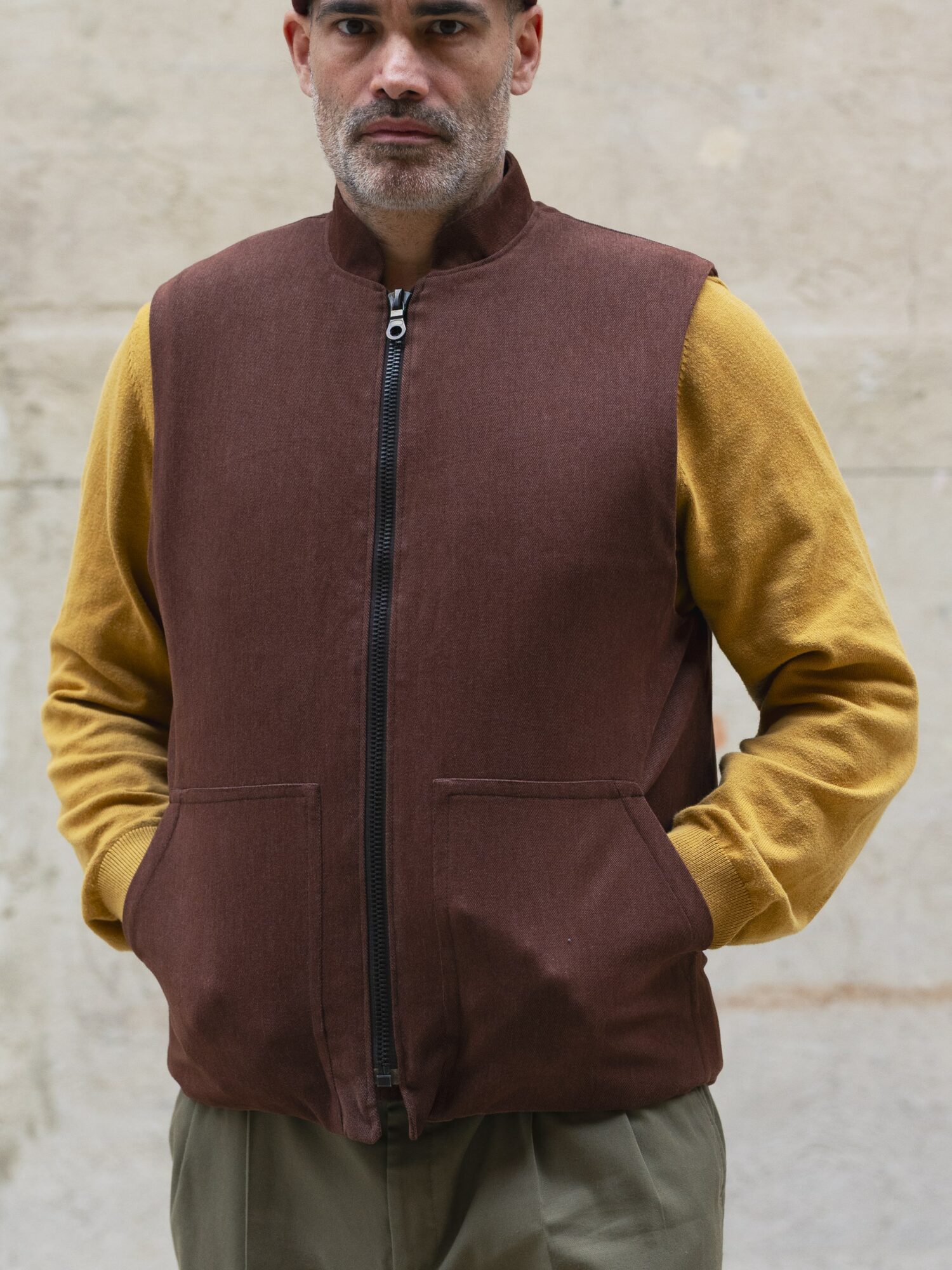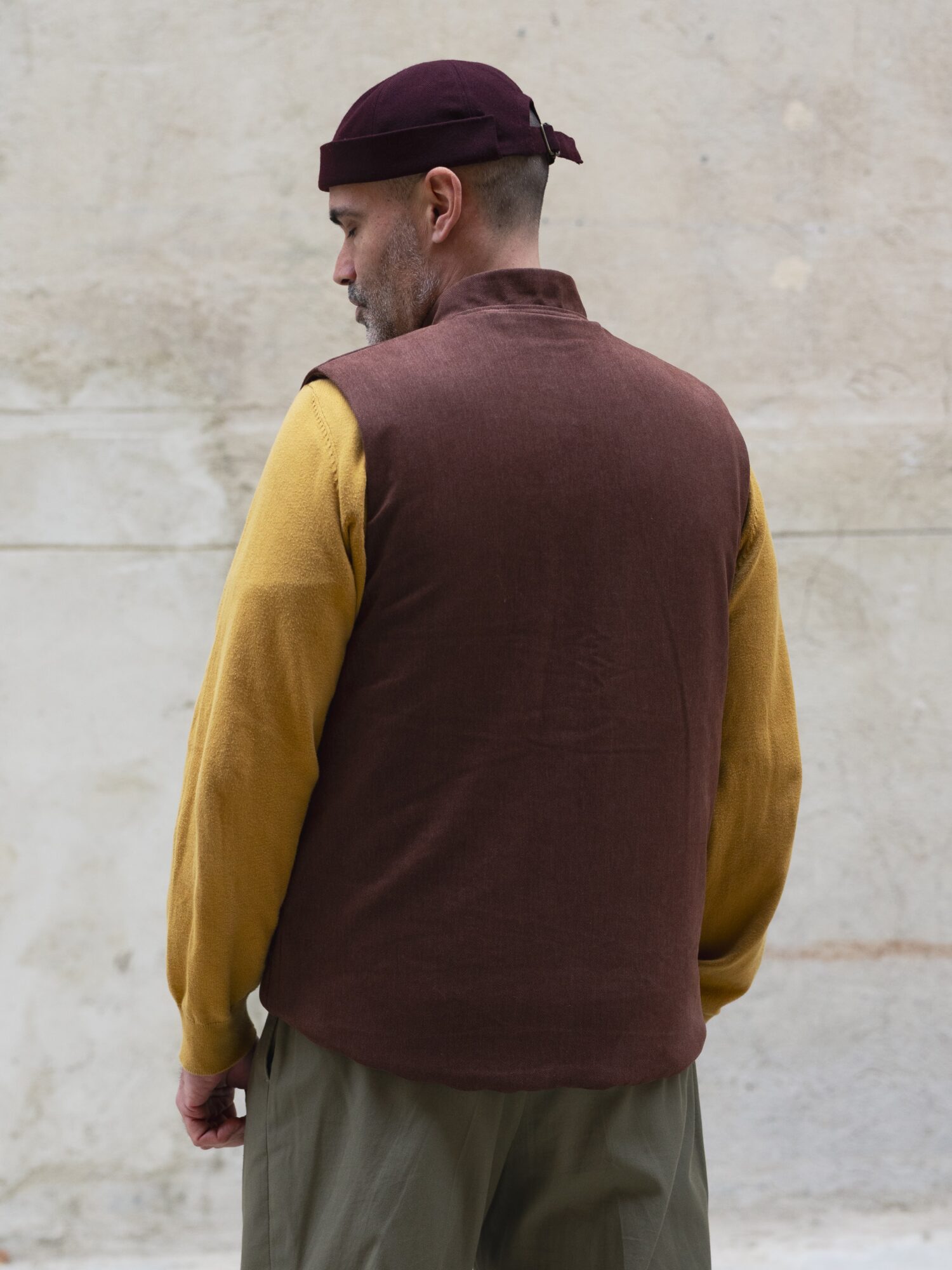 Ce gilet sergé coton marron foncé avec une doublure en laine rouille épaisse, d’Atelier Lucille Maillet est une fabrication artisanale drômoise. Il est pensé pour durer et être réparé si besoin. Il est prévu pour être porté par-dessus ses propres vêtements pour apporter de la chaleur et du confort sans contraindre les mouvements.
