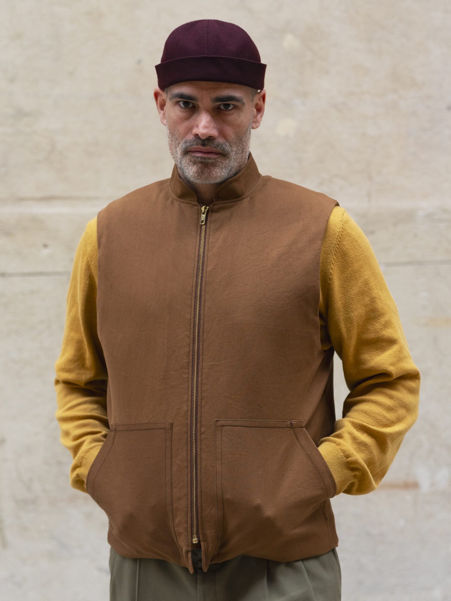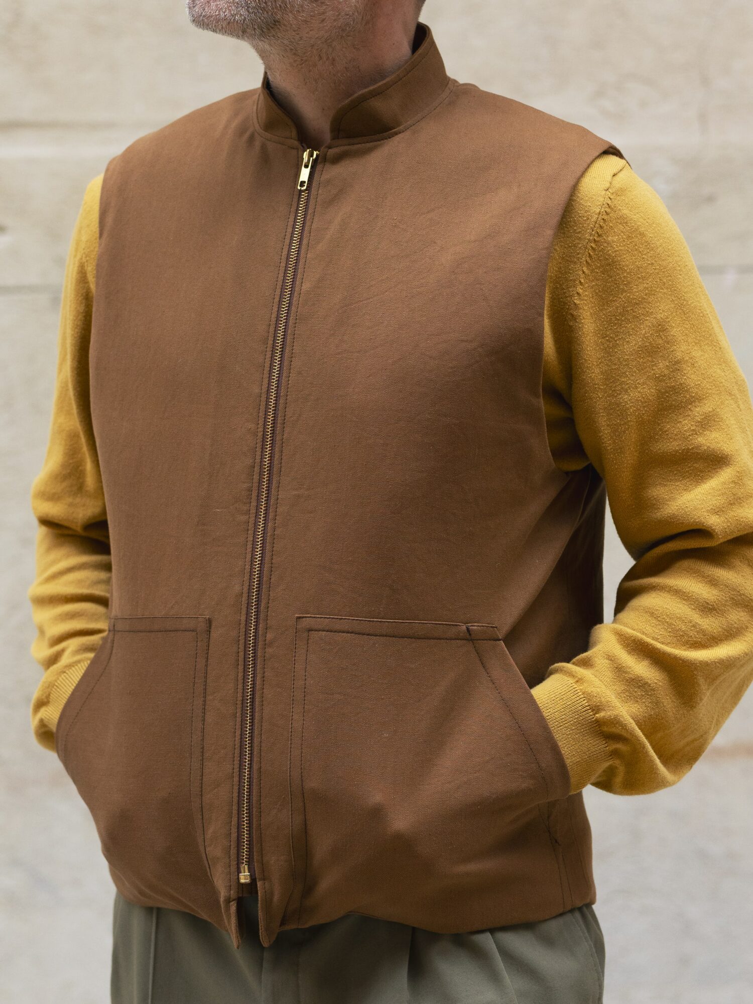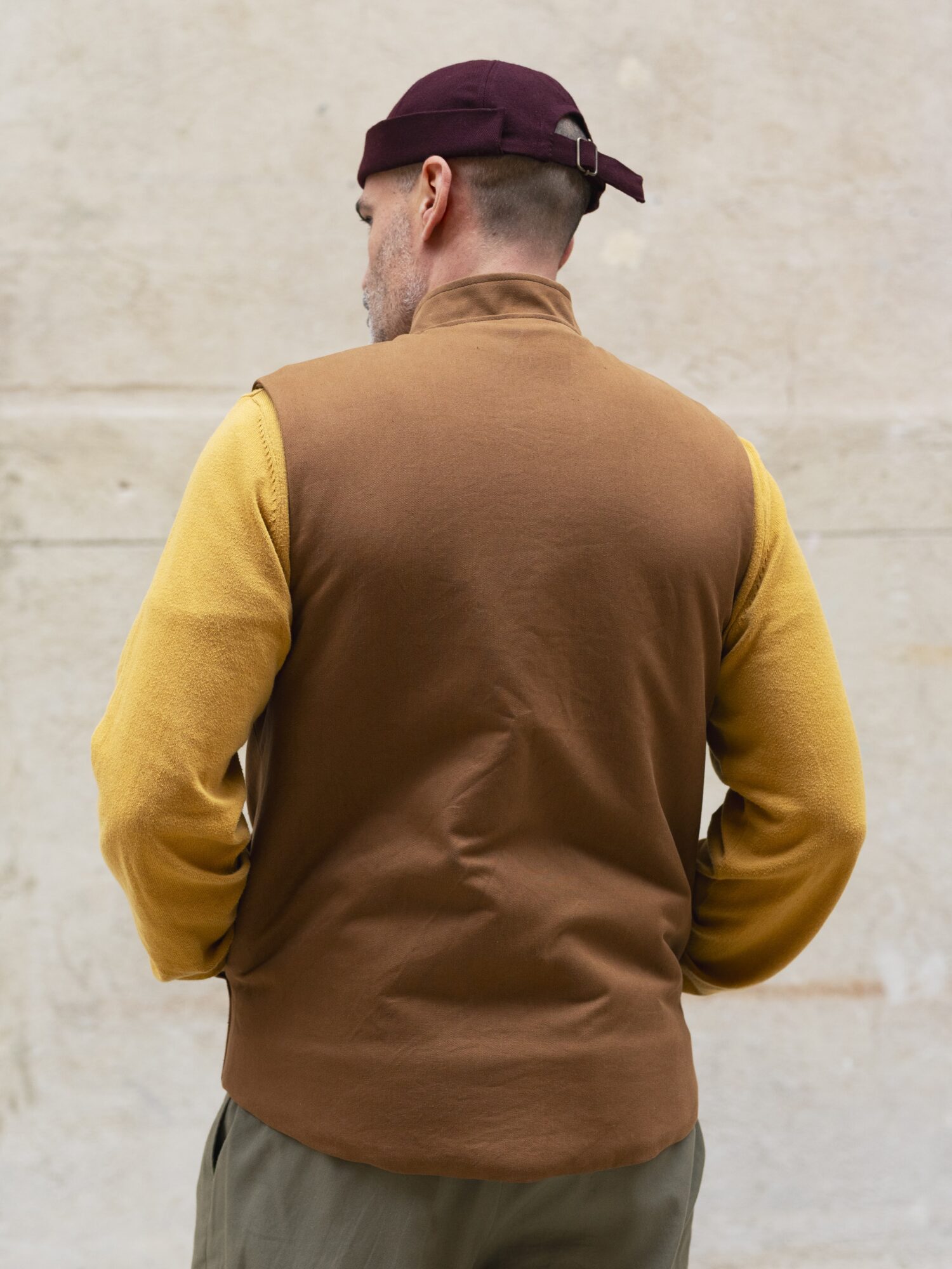 Ce gilet toile coton marron avec une doublure en laine marron motif beige, d’Atelier Lucille Maillet est une fabrication artisanale drômoise. Il est pensé pour durer et être réparé si besoin. Il est prévu pour être porté par-dessus ses propres vêtements pour apporter de la chaleur et du confort sans contraindre les mouvements.